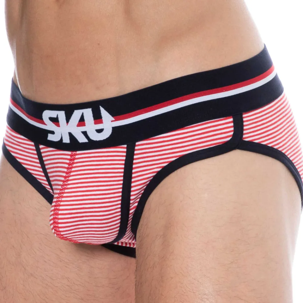Slip sport et sexy en coton premium doux et extensible. Fine rayure horizontale. Coupe taille basse ajustée. Poche frontale préformée assurant un excellent maintien. Confort enveloppant sur les fesses. Belle échancrure sur le côté. Ceinture tricolore large et douce signée SKU. Bordures contrastées.