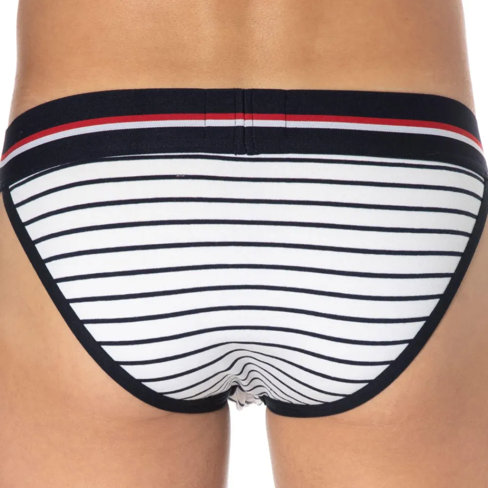 Slip sport et sexy en coton premium doux et extensible de couleur intense. Coupe tanga taille basse et ajustée. Poche frontale préformée assurant un excellent maintien. Confort enveloppant sur les fesses. Belle échancrure sur le côté. Ceinture tricolore large et douce signée SKU. Bordures contrastées.
