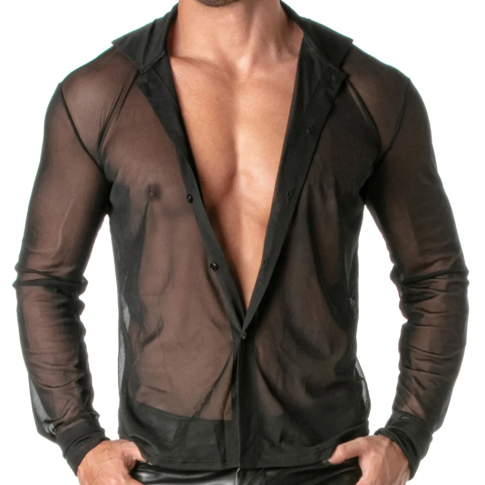 Chemise provocante en résille extensible et transparente. Coupe cintrée. Manches longues. Patte 5 boutons. Etiquette TOF Paris. Fabrication française.