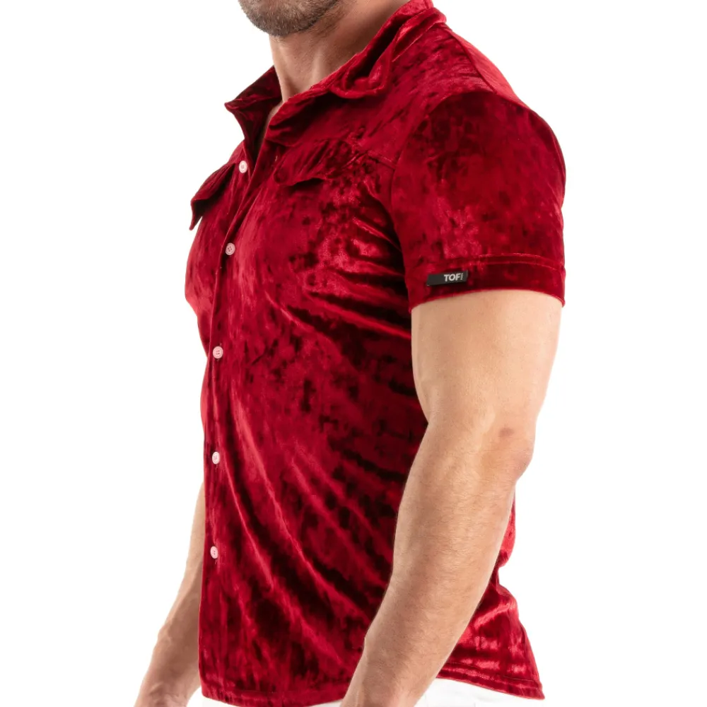 Chemise cintrée en velours satiné au style rétro chic. Manches courtes. Deux poches à rabat. Logo TOF Paris brodé sur la manche gauche. Fabrication française.