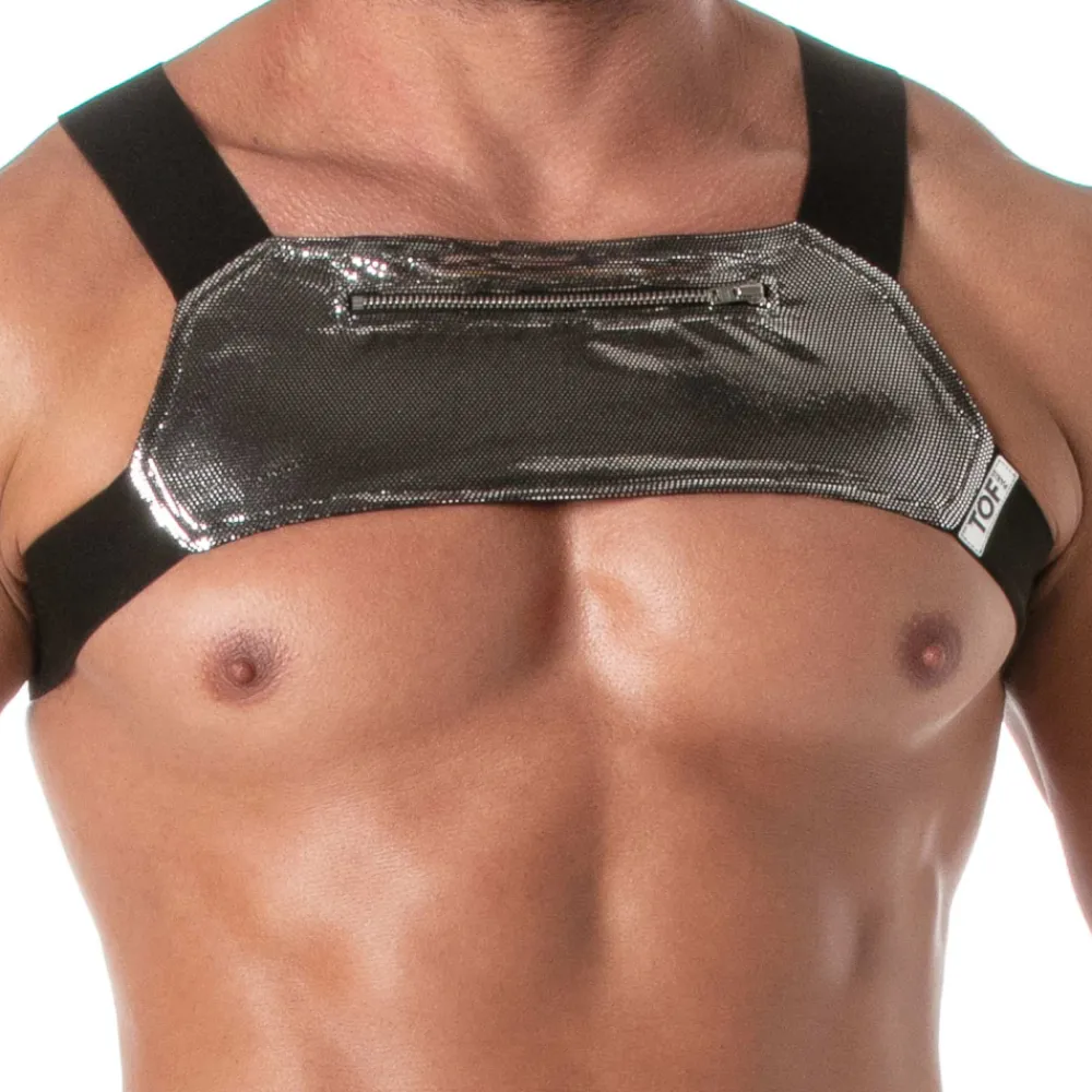 Harnais sexy et provocant en microfibre extensible pour un look fetish. Tissu orné de ronds brillants qui captent la lumière avec élégance. Elastiques constratsés extensibles croisés dans le dos. Poche à fermeture éclair sur la poitrine. Etiquette en simili-cuir signée TOF Paris.