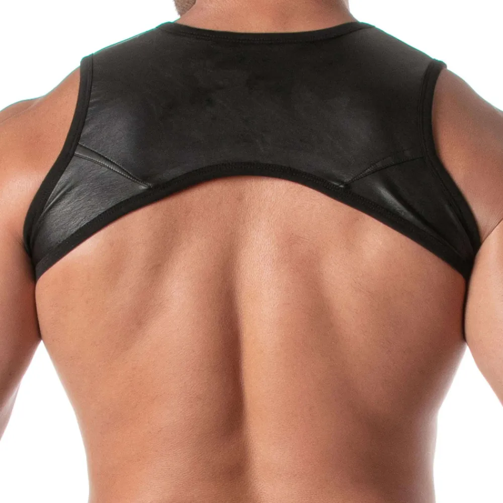 Harnais sexy et provocant en simili-cuir extensible pour un look fetish. 2 anneaux métalliques permettent d’accrocher des bretelles ou autres accessoires (vendus séparément). Poche à fermeture Eclair sur la poitrine avec étiquette en silicone TOF Paris. Fabrication française. Conseils d’entretien : laver en machine à 30°, ne pas sécher en machine, ne pas repasser.