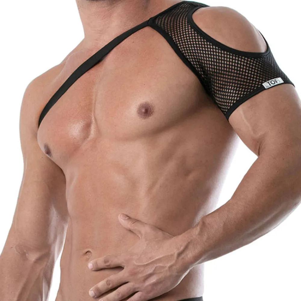 Harnais d’épaule en résille à maille large. Peut se porter à gauche comme à droite. Logo TOF argenté. Fabrication française.