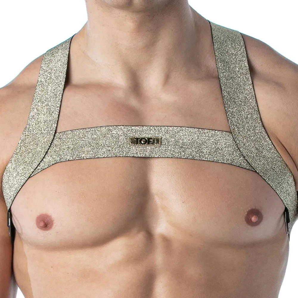 Harnais constitué de bandes élastique en fils métallisés Lurex qui forment un X dans le dos. Devant, la forme en H met en valeur vos pectoraux. 2 anneaux métalliques pour accrocher des bretelles ou autre accessoire. Etiquette TOF en silicone. Fabrication française.