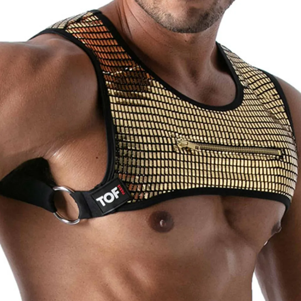 Harnais en microfibre pailletée dotée d’une poche à fermeture Eclair sur la poitrine. 2 anneaux métaliques pour accrocher les bretelles (vendues sparément). Logo TOF en silicone. Fabrication française. Conseils d’entretien : laver à la main, ne pas sécher en machine, ne pas repasser.