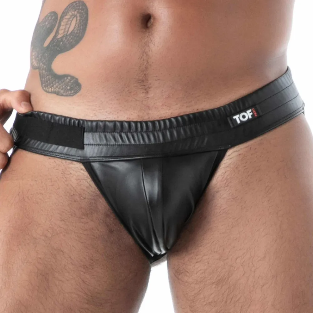 Jockstrap sexy et provocant en simili-cuir extensible pour un look fetish. Coupe taille basse et ajustée. Poche frontale non doublée. Large ceinture élastique avec logo TOF Paris en silicone. Bande renforcée sur la ceinture pour fixer des accessoires. Fabrication française. Conseils d’entretien : laver à 30°, ne pas sécher en machine, ne pas repasser.