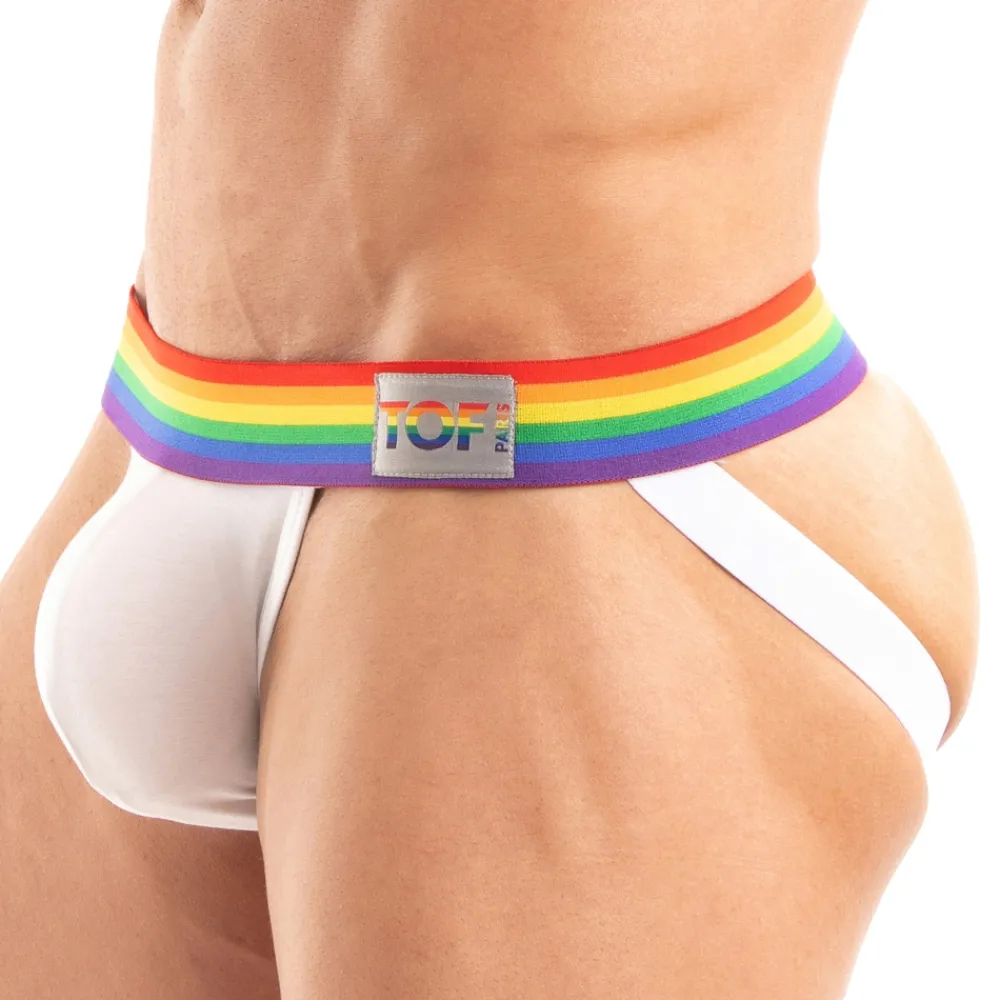 Jockstrap en coton extensible très doux et confortable. Coupe taille basse, simple et élégante. Poche frontale non doublée. Ceinture élastique aux couleurs de l’arc-en-ciel avec étiquette satinée TOF Paris. Fabrication française.