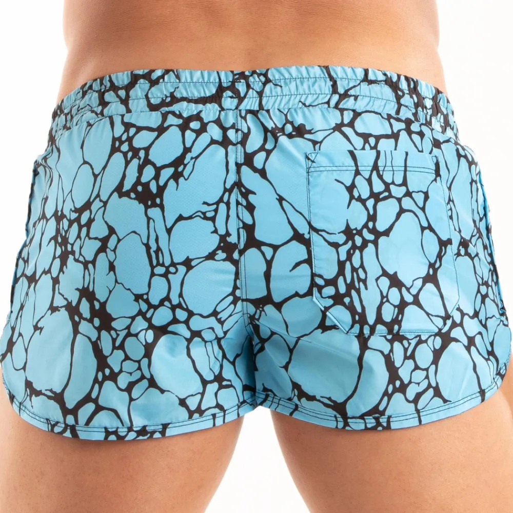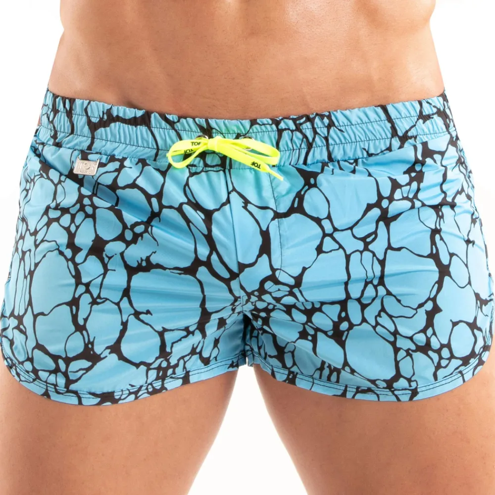 Short de bain taille basse très confortable en microfibre douce et légère, séchant rapidement. Coupe courte très ajustée. Imprimé bleu évoquant les reflets de l’eau dans la piscine. Plaque métallique TOF Paris. Braguette factice. Poche arrière. Slip intérieur en mesh. Ceinture élastique avec cordon de serrage de couleur fluo. Fabrication française.