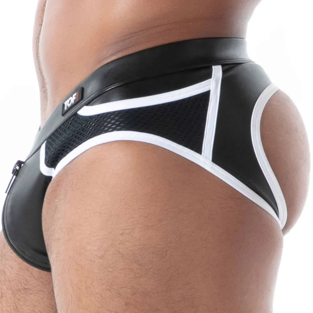 Slip sexy et provocant en simili-cuir extensible pour un look fetish. L’arrière a été découpé – à la manière d’un jockstrap – afin d’offrir une totale liberté de mouvement. Fermeture Eclair fonctionnelle pour ouvrir la poche frontale. Petites poches latérales en résille. Fabrication française. Conseils d’entretien : laver à 30°, ne pas sécher en machine, ne pas repasser.
