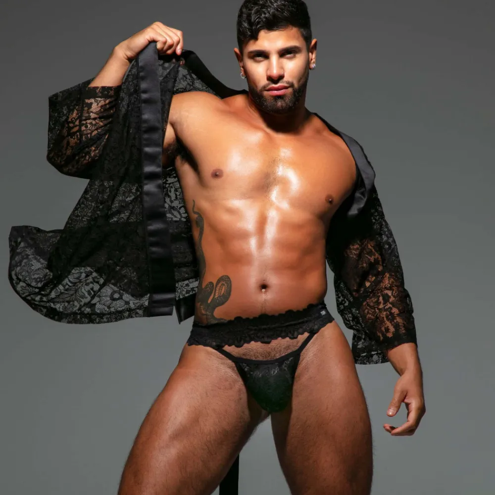 String audacieux et sensuel en fine dentelle transparente décorée d’un subtil motif floral. Design original avec sa grande ouverture entre la poche frontale et la large ceinture signée TOF Paris. Fabrication française.