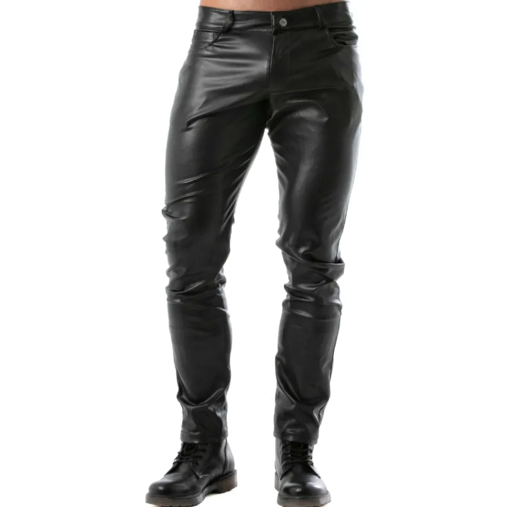 Pantalon sexy en simili-cuir extensible pour un look fetish. Empiècement détachable sur les fesses grpace à une fermeture Eclair et des boutons-pression. 3 poches. Braguette à boutons et fermeture Eclair. Passants de ceinture. Fabrication française.