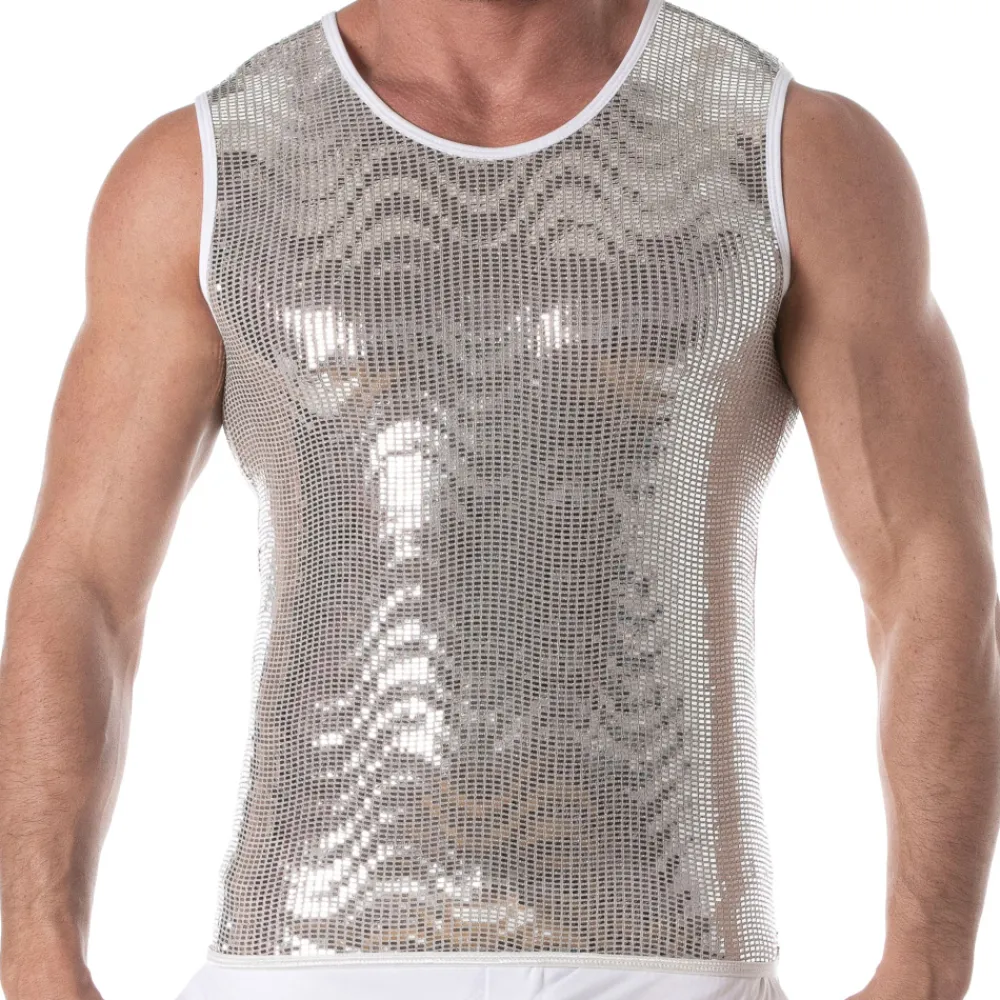 Débardeur sexy en microfibre recouverte de carreaux scintillants pour un effet boule à facette. Bordures contrastées. Col rond. Logo TOF Paris sur la poitrine. Fabrication française. Conseils d’entretien : laver à la main, ne pas sécher en machine, ne pas repasser.