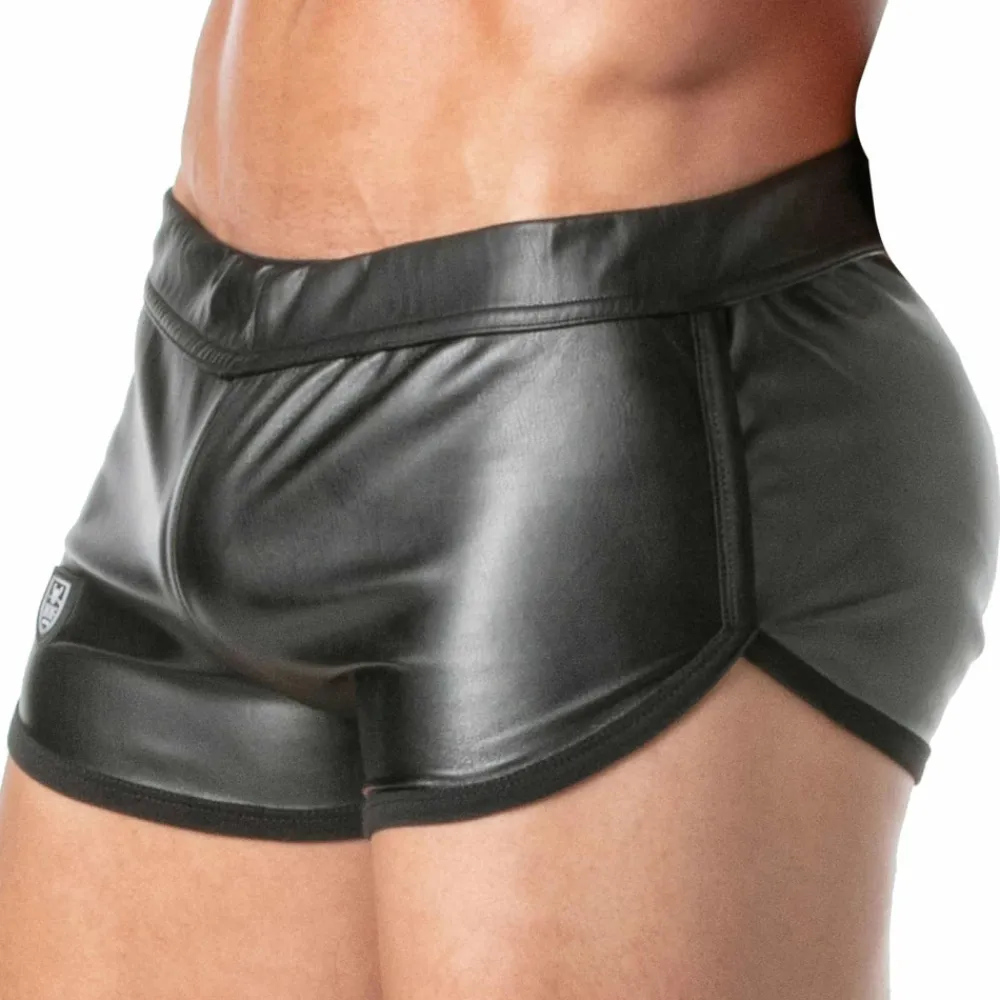 Short sexy en simili-cuir extensible pour un look fetish. Coupe courte, ajustée et échancrée sur les côtés. Poche arrière. Poche intérieure pour un meilleur confort frontal. Logo TOF Paris sur la jambe gauche. Ceinture élastique. Fabrication française.