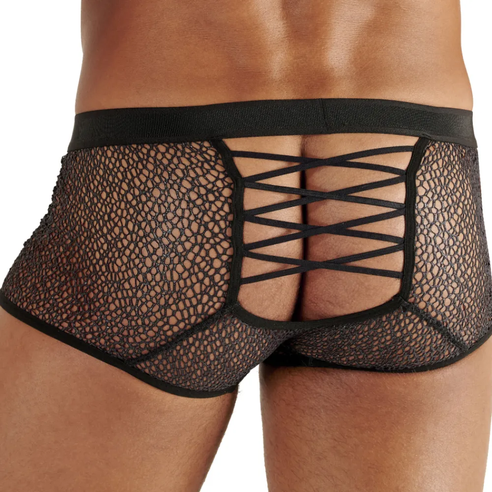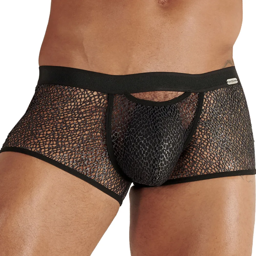 Boxer sexy et provocant en résille métallisée, dont le maillage large laisse peu de place à l’imagination. Coupe taille basse très ajustée. Ouverture provocante au-dessus de la poche. Laçage façon corset, offrant une ouverture audacieuse sur les fesses. Ceinture élastique avec petite plaque métallique signée WOH.
