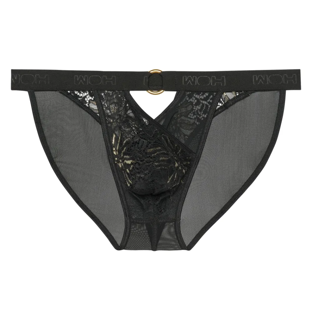 Slip audacieux et élégant en dentelle noir et or et tulle transparent. Design croisé dessinant une découpe provocante au-dessus du pubis et en haut des fesses. Telle un bijou, une boucle dorée décore la fine ceinture élastique signée WOH.