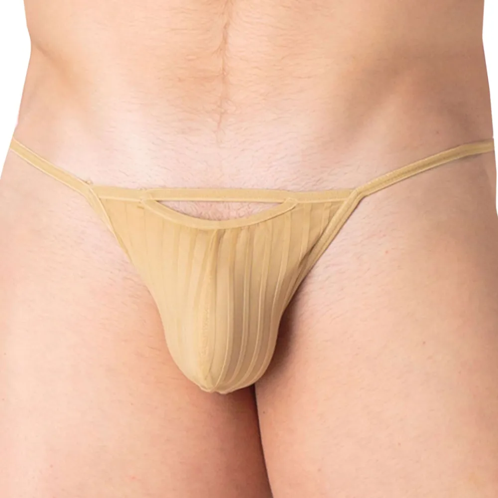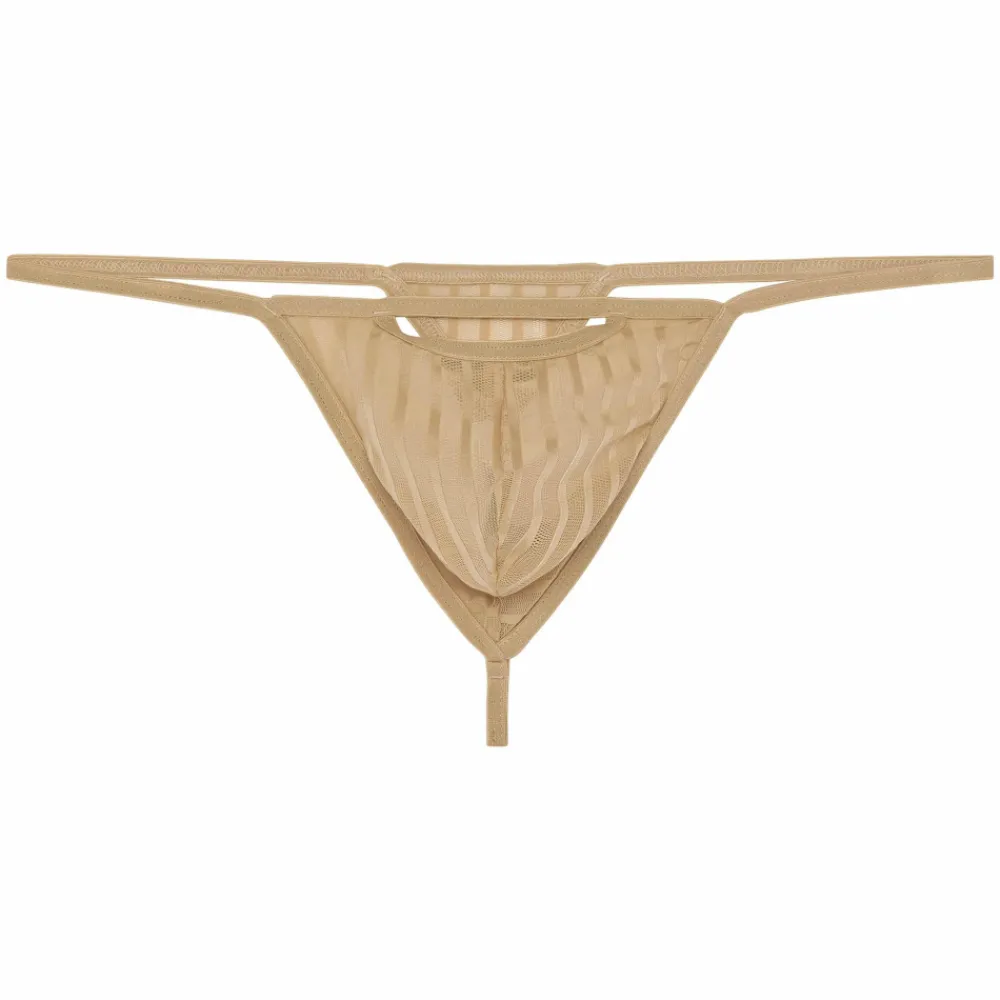 String ficelle, sexy et élégant, en résille fine et luxueuse. Alternance de rayures verticales opaques et transparentes. Poche frontale non doublée, surmontée d’une ouverture provocante.