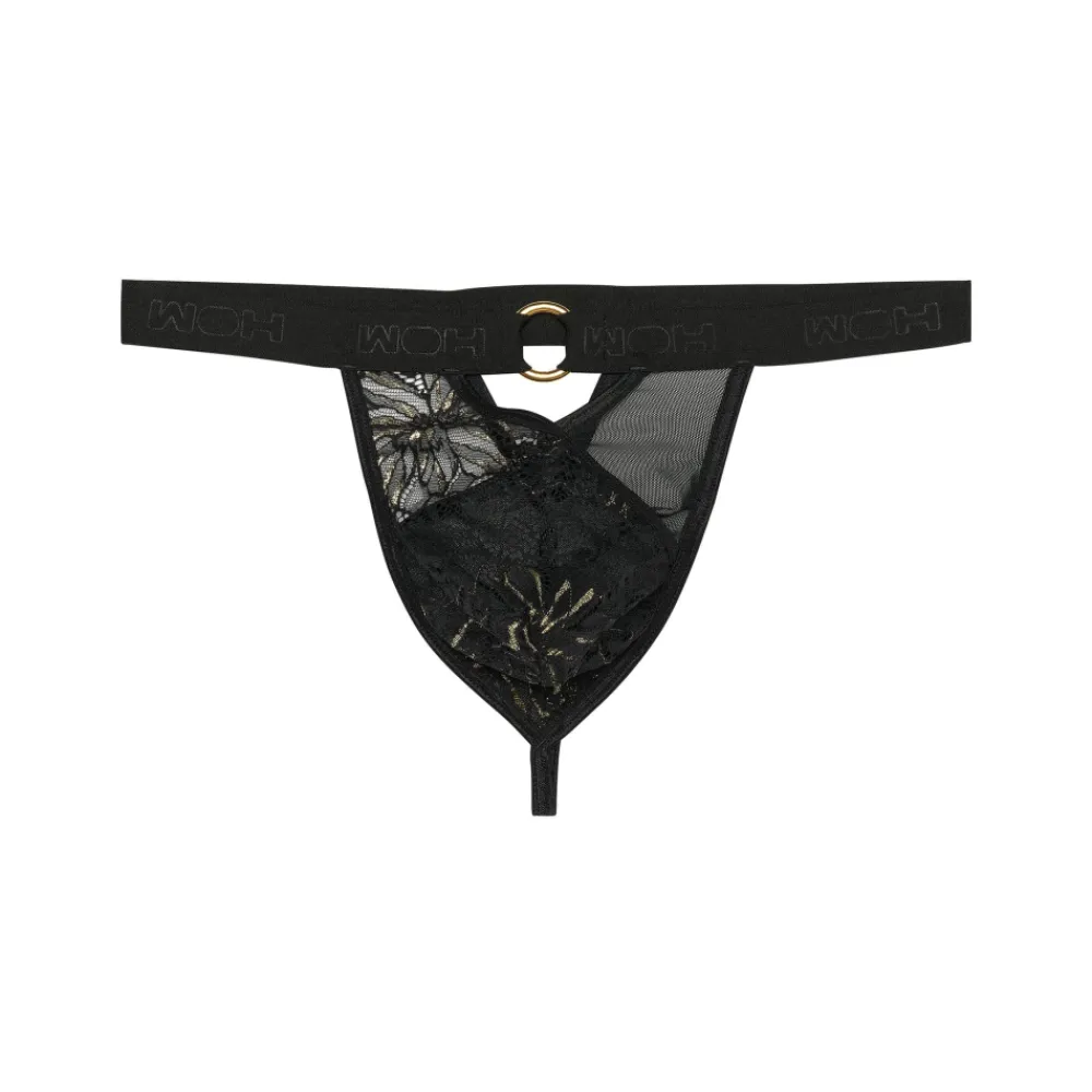 String audacieux et élégant en dentelle noir et or et tulle transparent. Design croisé dessinant une découpe provocante au-dessus du pubis. Telle un bijou, une boucle dorée décore la fine ceinture élastique signée WOH.