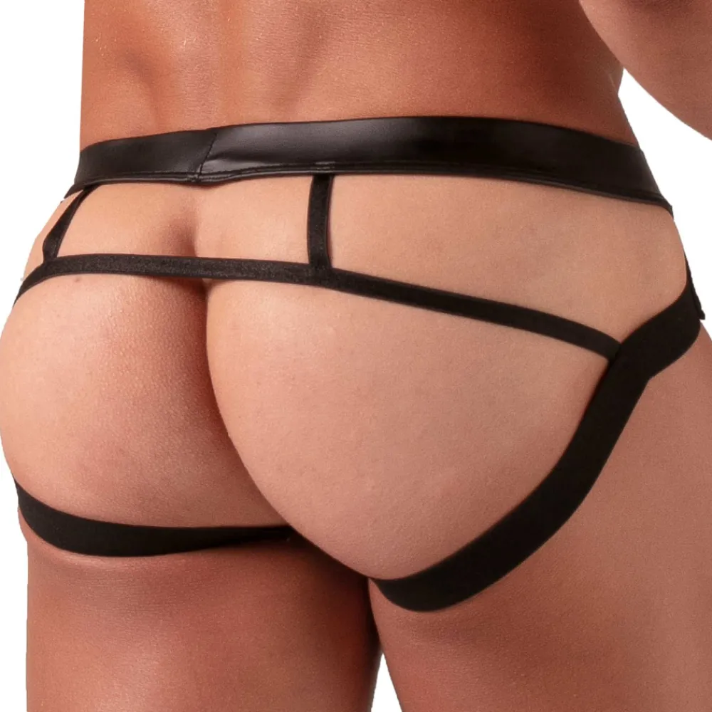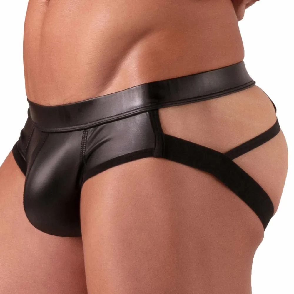 Jockstrap sexy et confortable en simili-cuir extensible pour un look fetish. Design original à l’arrière. Poche frontale non doublée. Ceinture élastique recouverte. Petite poche secrète. Fabrication française.