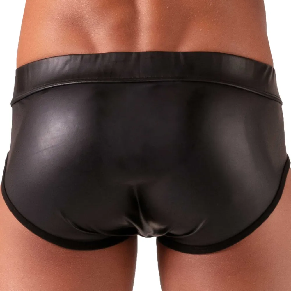 Slip sexy et provocant en simili-cuir extensible pour un look fetish. Laçage façon corset pour ouvrir la poche frontale. Ceinture élastique recouverte. Petite poche secrète. Fabrication française.