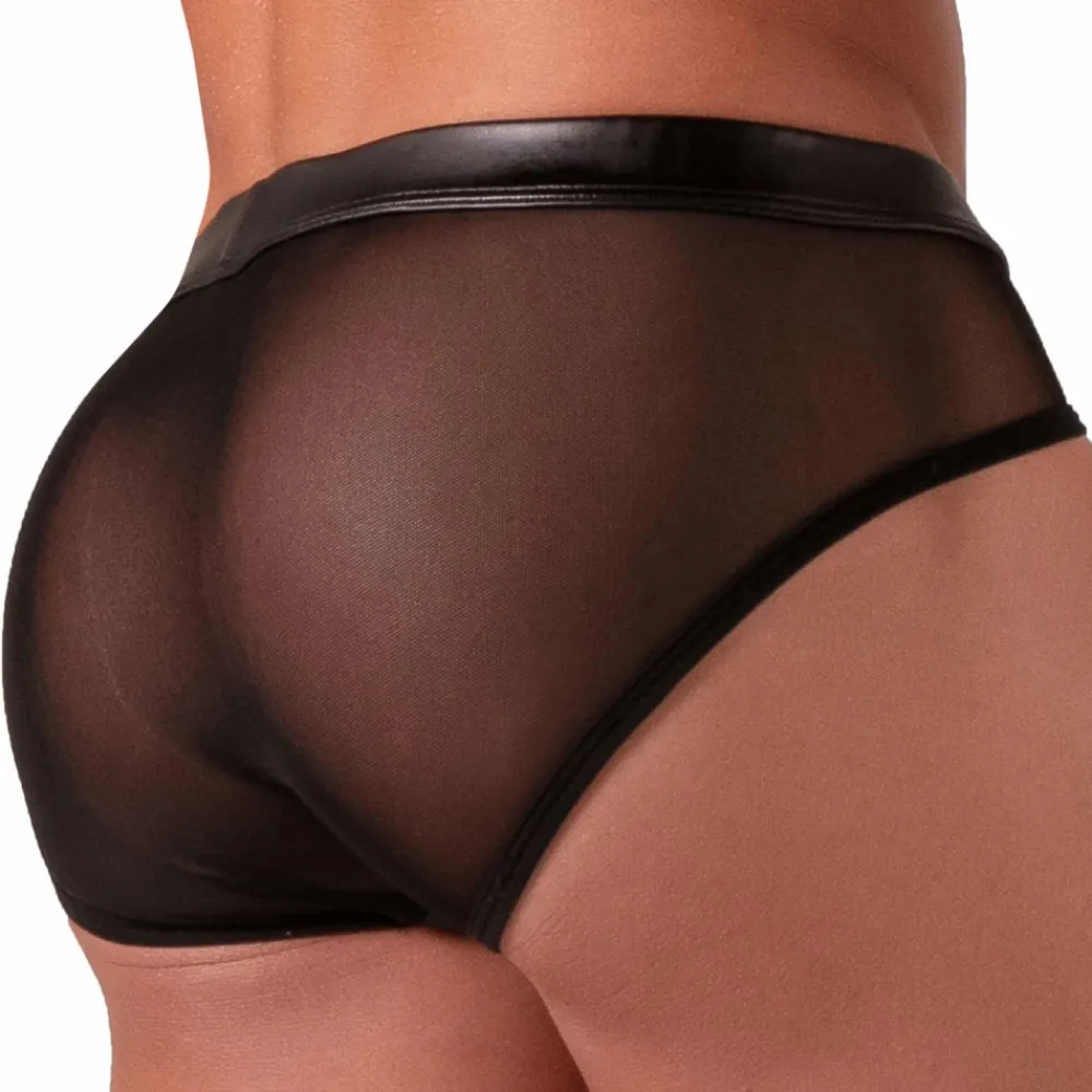 Slip sexy en résille extensible et transparente. Poche frontale en simili-cuir avec fermeture Eclair fonctionnelle. Ceinture élastique recouverte. Petite poche secrète. Fabrication française.