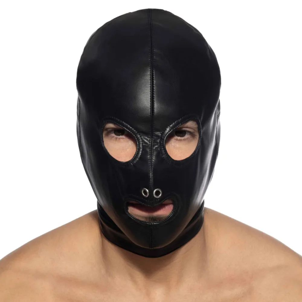 Cagoule en microfibre stretch imitant parfaitement le cuir, pour un look très fetish. Orifices pour les yeux et la bouche, oeillets métalliques pour le nez. Idéal pour les jeux de domination et de soumission. Laçage façon corset et boucle métallique à l’arrière pour un ajustement parfait. Logo AD Fetish en silicone.
