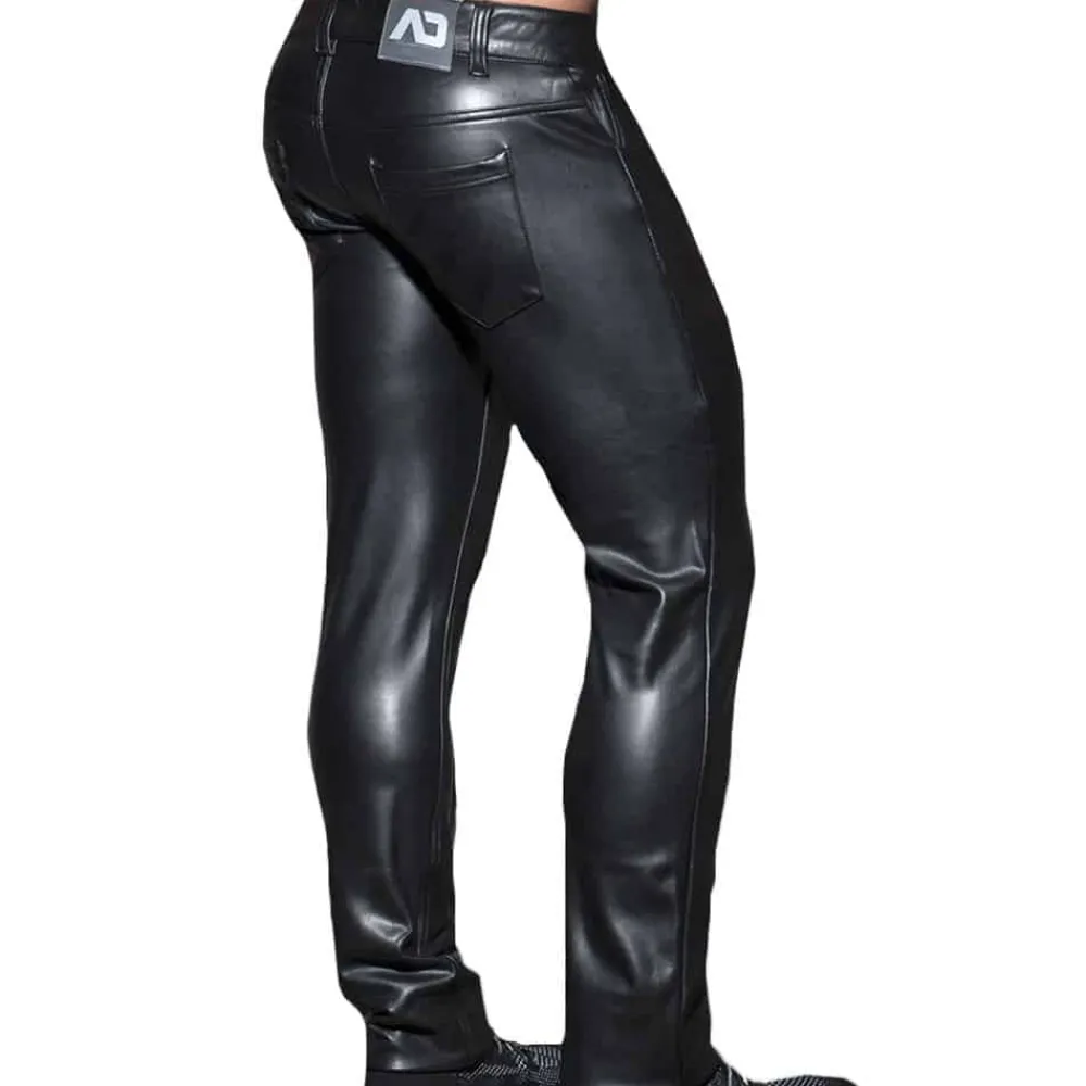 Pantalon taille basse en simili cuir lisse, extensible et résistant. Coupe ajustée qui souligne les formes pour un look très sexy. 2 poches à l’avant et 2 poches à l’arrière. Braguette avec fermeture Eclair et 1 bouton. Passants de ceinture. Etiquette AD en silicone à l’arrière.
