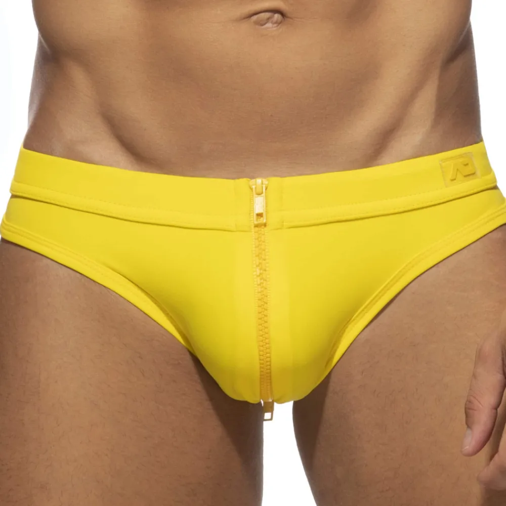 Slip de bain sexy en microfibre extensible séchant rapidement. Fermetures Eclair devant et derrière, chacune à double sens, pour une invitation au jeu. Poche frontale doublée de grande capacité. Logo AD en silicone sur la ceinture élastique.