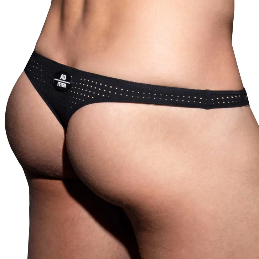 String taille basse en microfibre perforée, extensible, légère et respirante de couleur unie. Poche frontale moulée sans couture pour un confort optimal. Etiquette AD Fetish en silicone à l’arrière.