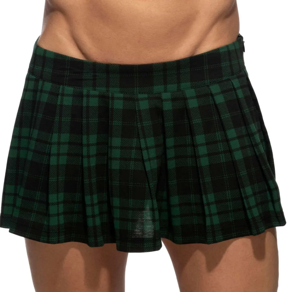 Jupe courte et plissée en mélange de viscose et de microfibre. Tissu imprimé d’un motif tartan. Technologie RingUp intégrant un anneau cock ring en silicone (diamètre 5 cm, amovible par bouton pression). Fermeture Eclair discrète que le côté. Logo AD en silicone.