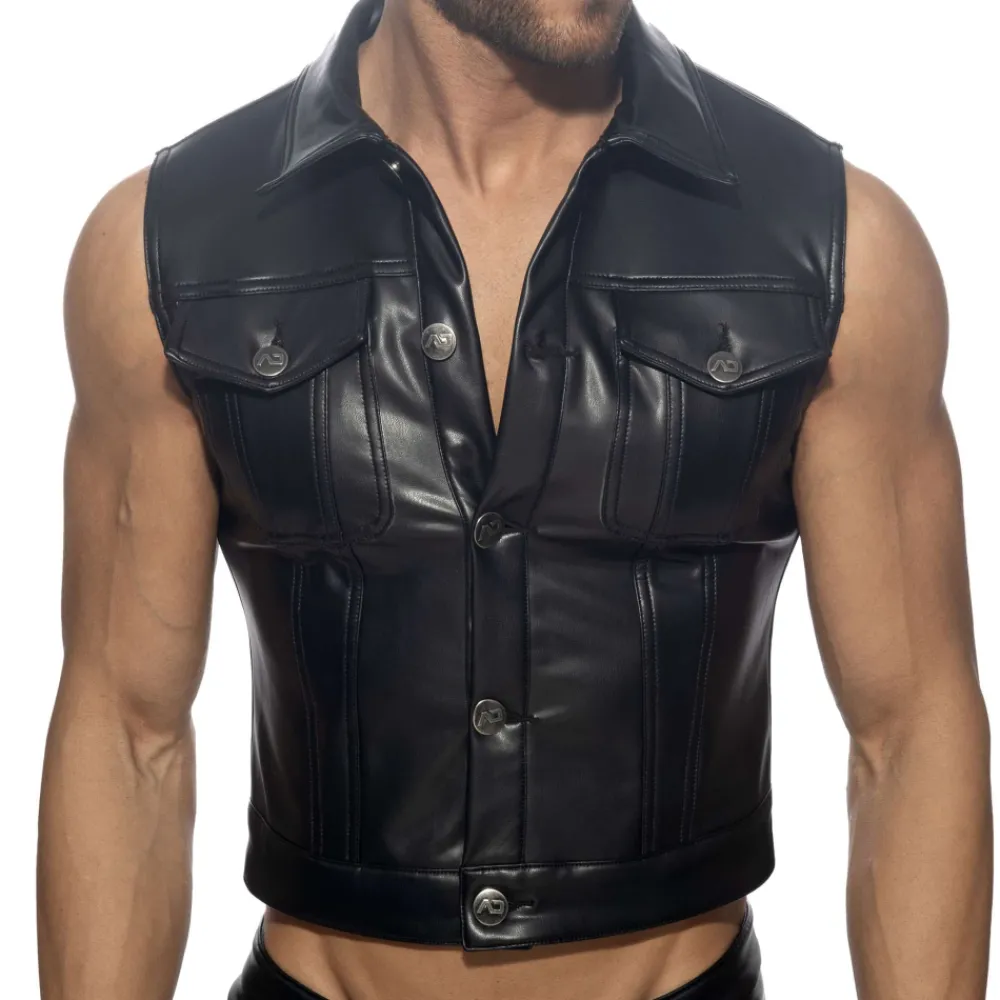 Veste biker sans manches en microfibre stretch imitant parfaitement le cuir, pour un look très fetish. Coupe courte et cintrée. Ouverture 5 boutons. 2 grandes poches plaquées sur la poitrine. Molletonnée à l’intérieur. Logo AD Fetish en silicone en haut du dos.
