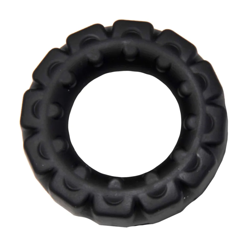 Anneau pénien pour une érection plus dure et plus longue. Design original en forme de pneu de camion. Fabriqué en caoutchouc de silicone liquide super doux et extensible. Diamètre interne 2,5 cm, externe 5 cm.