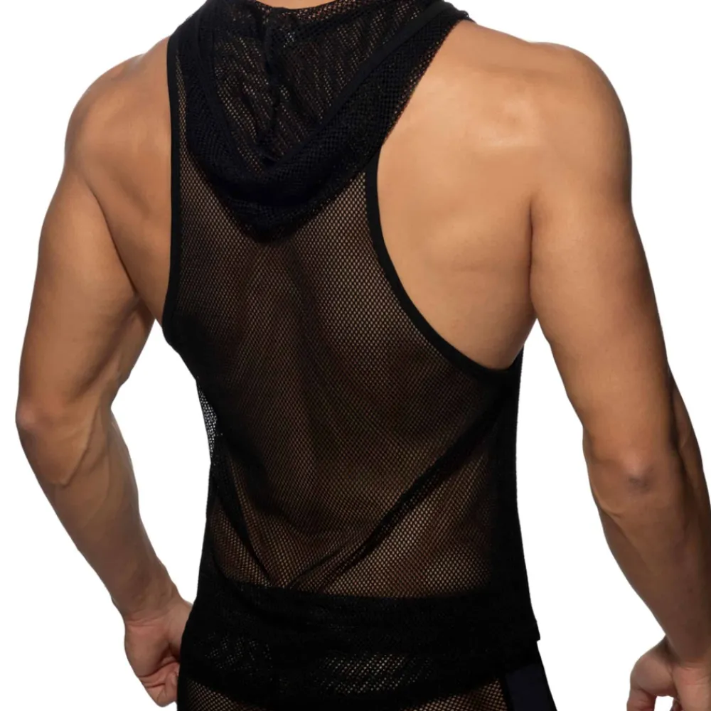 Débardeur à capuche en mesh sport transparent. Coupe arrondie en bas pour tomber parfaitement sur un jean ou un short. Col en V. Larges ouvertures sous les bras. Logo Addicted en silicone sur la poitrine.