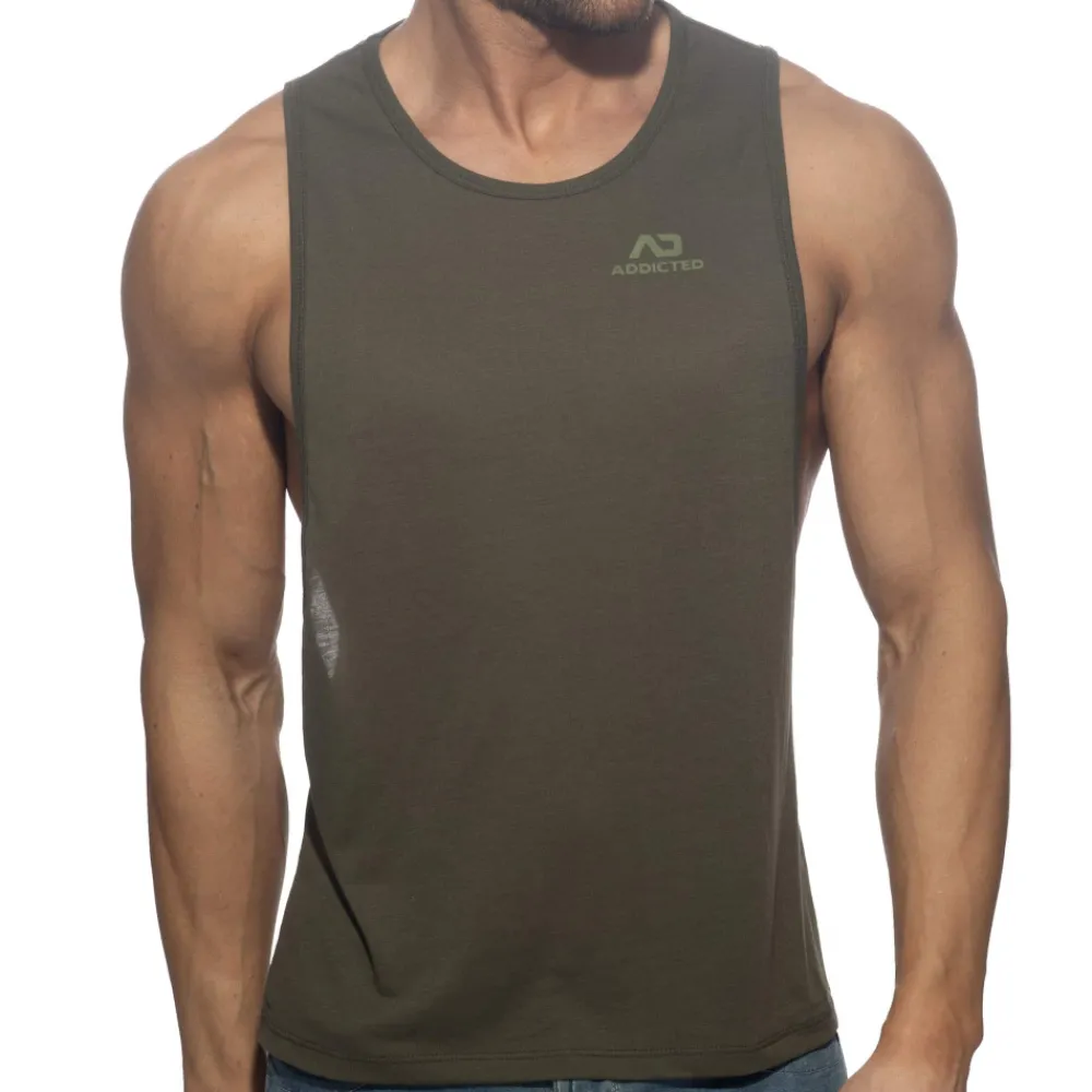 Débardeur en tissu très fin et confortable, idéal pour le sport. Large ouvertures sous les bras. Imprimé Addicted ton sur ton sur la poitrine gauche et dans le dos.