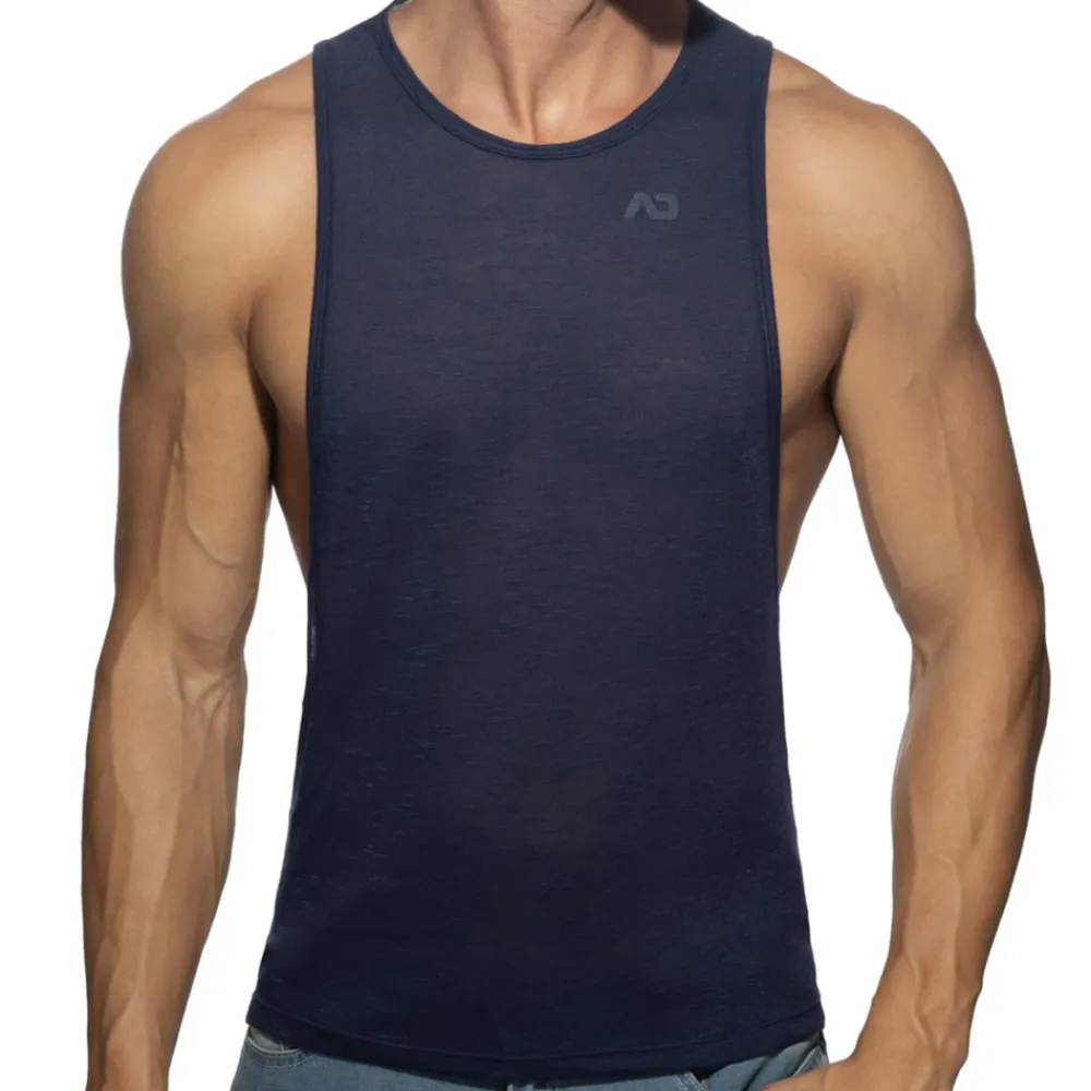 Débardeur en microfibre flammée très fine, légère, et semi-transparente. Large ouvertures sous les bras. Imprimé Addicted ton sur ton sur la poitrine et dans le dos.
