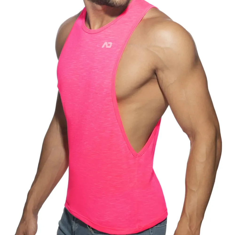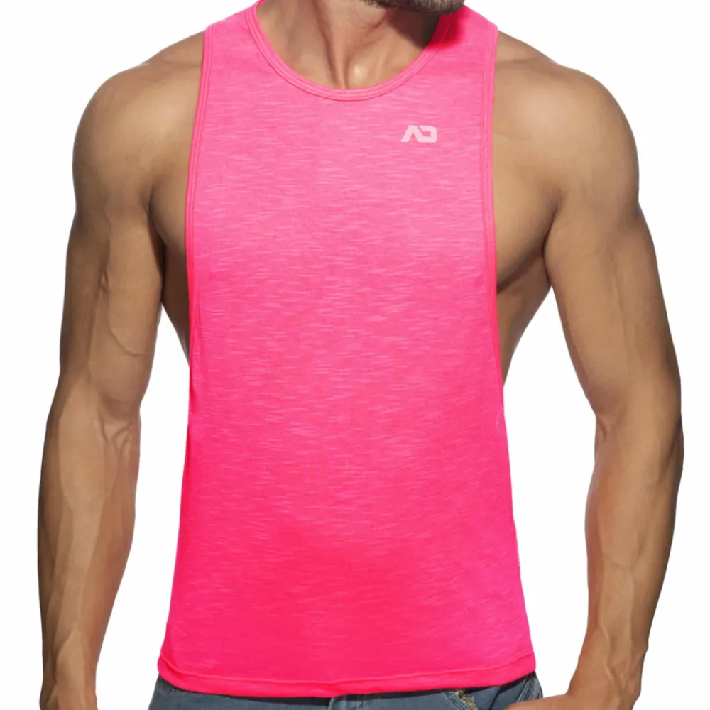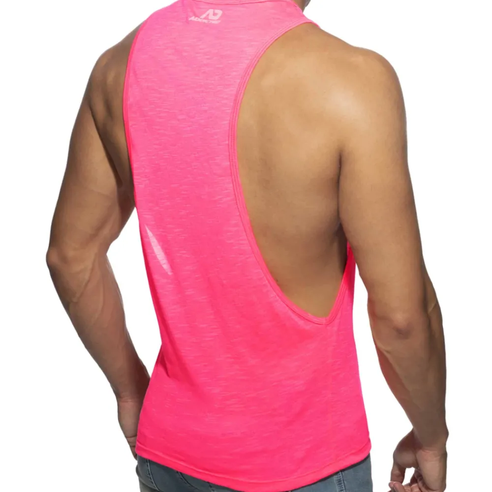 Débardeur en microfibre flammée très fine, légère, et semi-transparente. Large ouvertures sous les bras. Imprimé Addicted ton sur ton sur la poitrine et dans le dos.