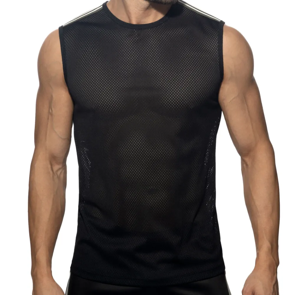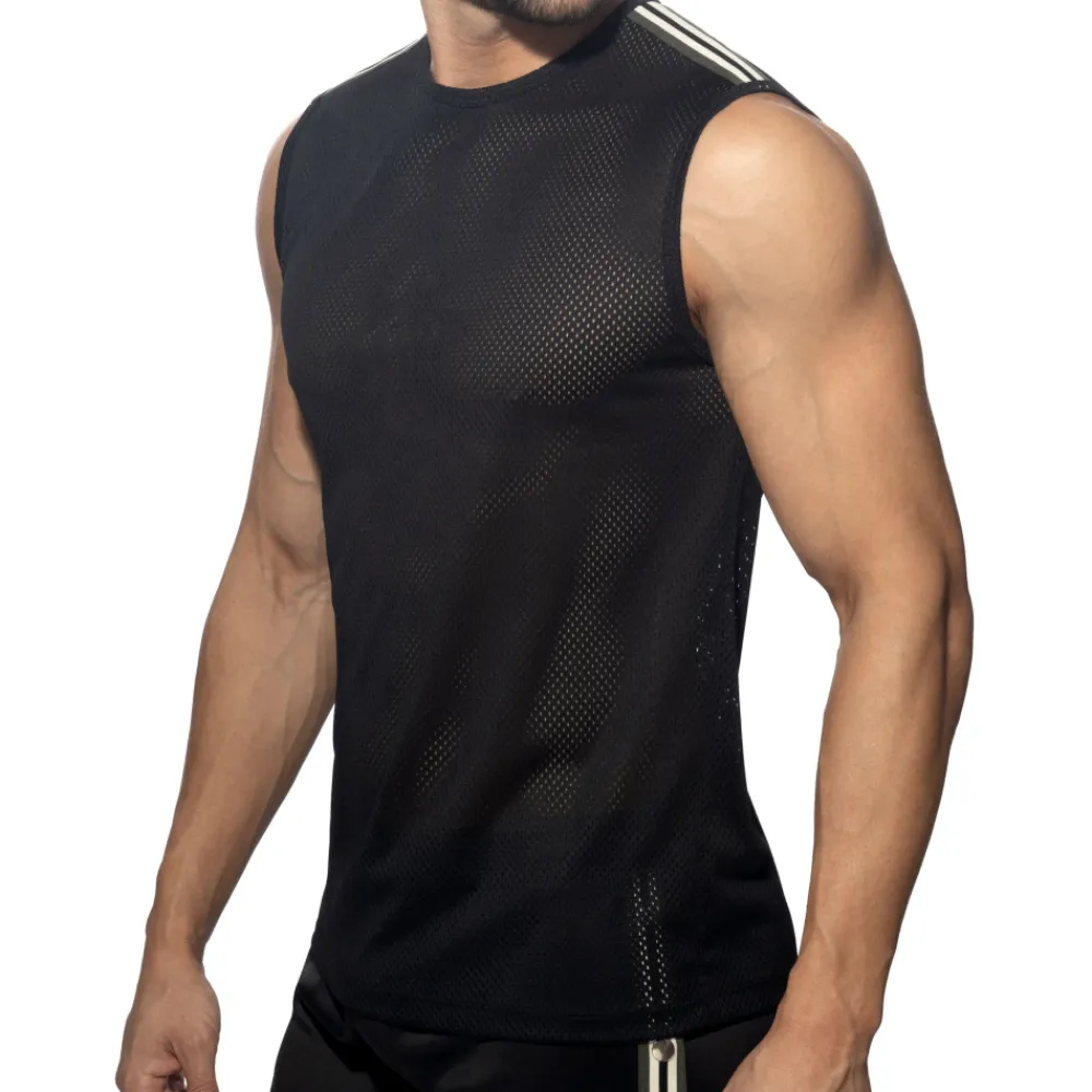 Débardeur sport en résille légère et respirante. Bandes tricolores sur les épaules. Etiquette AD en silicone dans le dos.