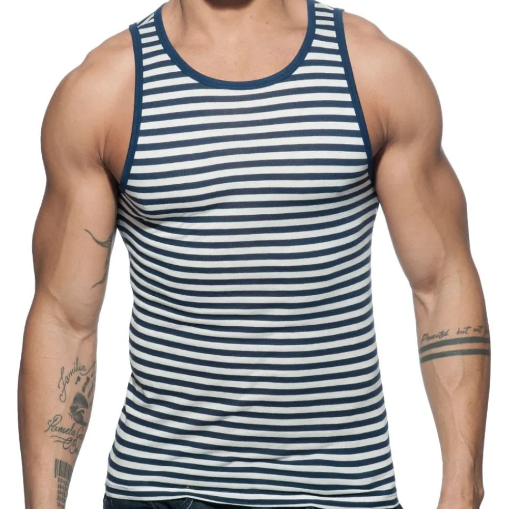 Débardeur très ajusté en mélange doux, frais et soyeux à base de viscose. Imprimé marinère très tendance. Bordures de couleur contrastée. Logo Addicted en silicone dans le dos. Fabriqué à Barcelone.