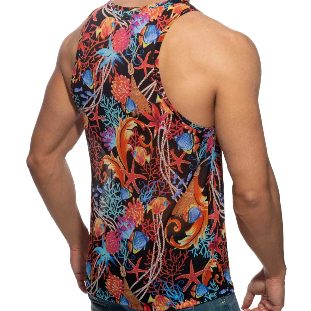 Débardeur chic et élégant en microfibre ultra légère et respirante. Imprimé récif coralien. Coupe ajustée. Col rond. Etiquette AD en silicone en haut du dos.