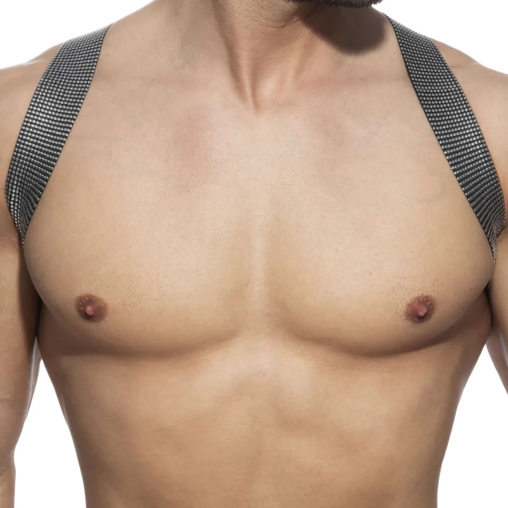 Harnais original et confortable, dont les larges bandes élastiques se croisent en formant un X dans le dos. Les straps sont recouverts de picots argentés apportants des reflets métalliques scintillants. Logo AD Party en silicone à l’arrière. Taille XS/S pour un tour de poitrine de 84 à 94 cm. M/L : 94 à 104 cm. XL/XXL : 104 à 114 cm.