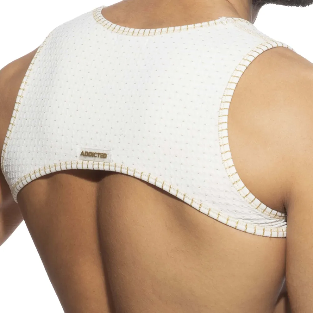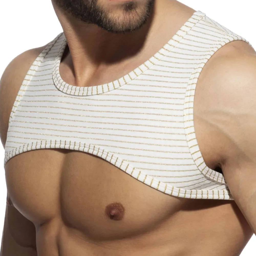 Harnais réversible en microfibre alliant élégance et confort. Grâce à la technologie U-Turn, il présente deux motifs distincts : fines rayures dorées d’un côté et pois dorés de l’autre. Logo AD en silicone à l’arrière.
