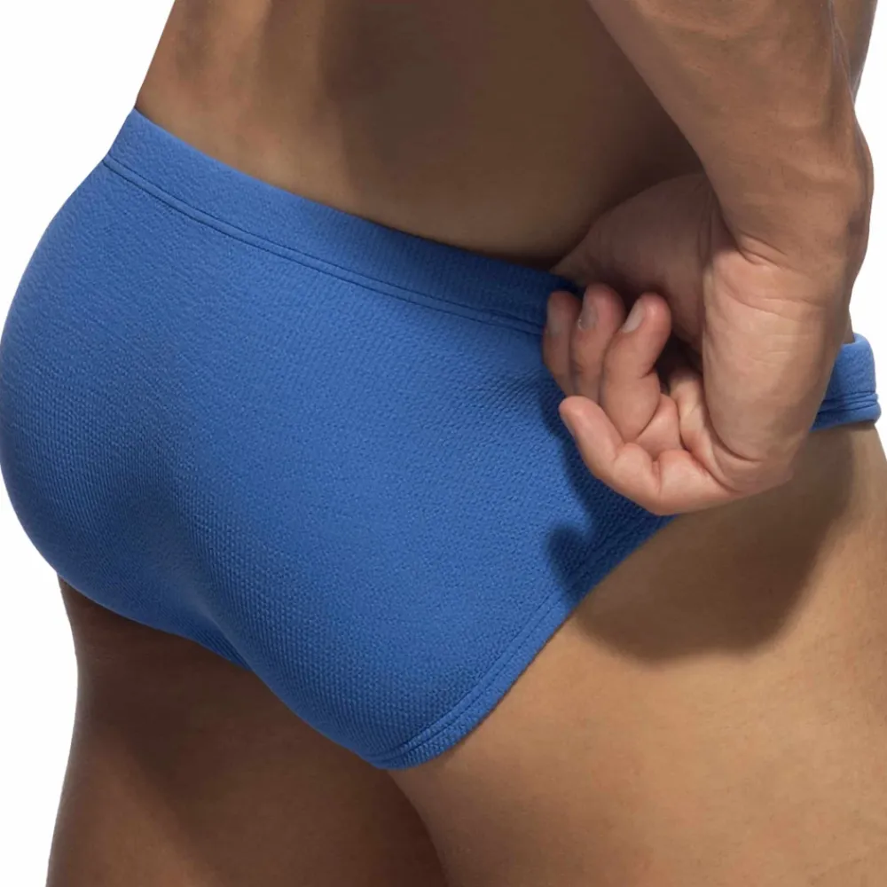 Slip de bain sexy en microfibre texturée luxueuse avec un effet froissé. Coupe taille basse et ajustée. Ceinture élastique avec cordon de serrage. Poche frontale moulée sans couture pour un confort optimal. Système Pack Up intégré avec mousse amovible pour mettre en valeur votre masculinité. Etiquette Addicted en silicone sur la hanche gauche.
