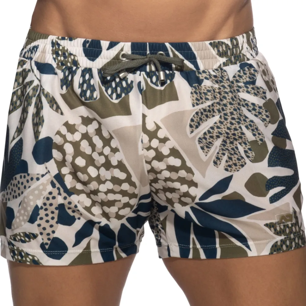 Short en microfibre respirante, douce et ultra légère. Imprimé tropical dans les tons kaki et bleu sur fond beige. Poches latérales. Ceinture élastique avec cordon de serrage. Etiquette AD en silicone sur la cuisse gauche.