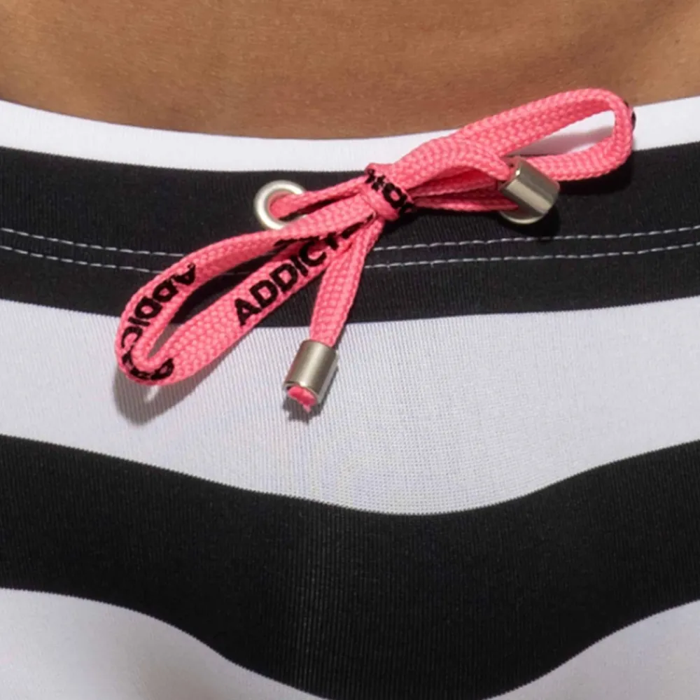 Boxer de bain court en microfibre extensible douce et légère. Larges rayures façon marinière. Coupe taille basse très ajustée. Ceinture élastique recouverte avec cordon de serrage. Poche frontale moulée sans couture pour un confort optimal. Logo Addicted en silicone sur la ceinture élastique recouverte.