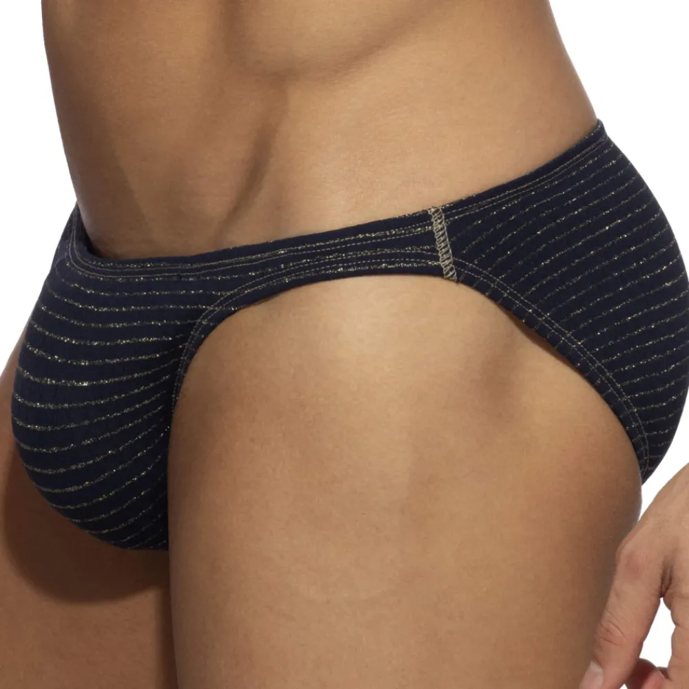 Slip de bain réversible en microfibre alliant élégance et confort. Grâce à la technologie U-Turn, il présente deux motifs distincts : de fines rayures dorées d’un côté et des pois dorés de l’autre. Poche frontale moulée sans couture pour un confort optimal. Coupe minimaliste, taille basse et ajustée. Etiquette AD en silicone à l’arrière.