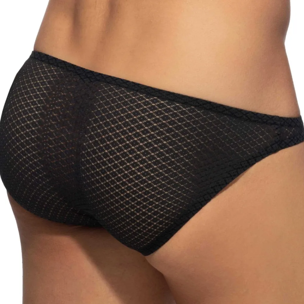 Slip taille basse très sexy en matière semi-transparente décoré d’un motif géométrique. Coupe minimaliste très ajustée. Poche frontale moulée sans couture pour un confort optimal. Logo Addicted en silicone sur la fine ceinture élastique.