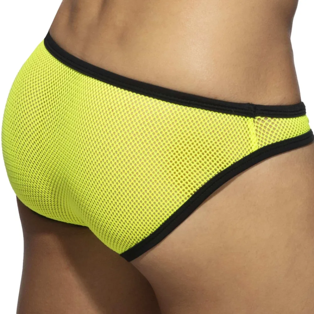 Slip sexy et provocant en résille extensible, dont le maillage large laisse peu de place à l’imagination. Coupe taille basse, minimaliste et très ajustée. Poche frontale moulée sans couture, pour un confort optimal. Bordures de couleur contrastée. Logo Addicted en silicone.