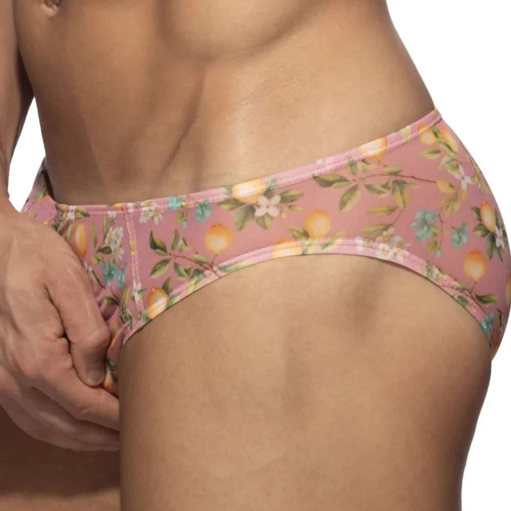 Slip luxueux en résille imprimée d’un motif pétillant fleurs et citrons. Tissu fin, super extensible et totalement transparent. Coupe taille basse, minimaliste et très ajustée. Belle poche frontale non doublée. Etiquette Addicted en silicone à l’arrière.