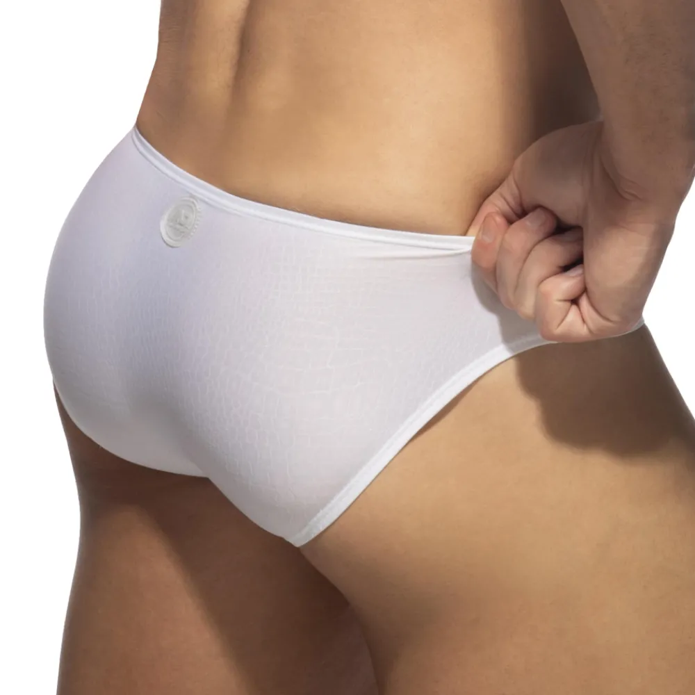 Slip bikini en microfibre douce et souple avec un effet peau de serpent. Tissu mat avec des zones de brillances très subtiles. Grande poche frontale non doublée. Logo AD Party en silicone à l’arrière.
