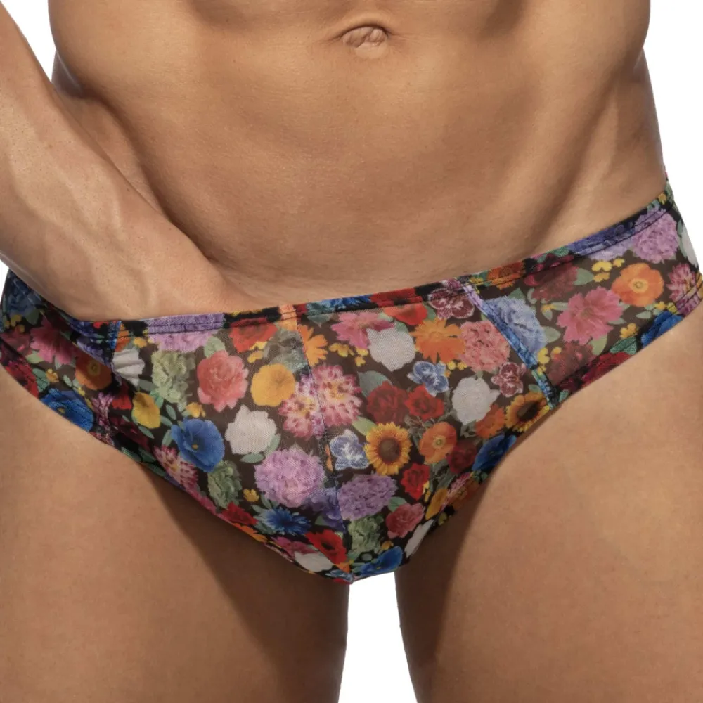 Slip luxueux en résille imprimée d’un motif floral très coloré. Tissu fin, super extensible et totalement transparent. Coupe taille basse, minimaliste et très ajustée. Belle poche frontale non doublée. Etiquette Addicted en silicone à l’arrière.