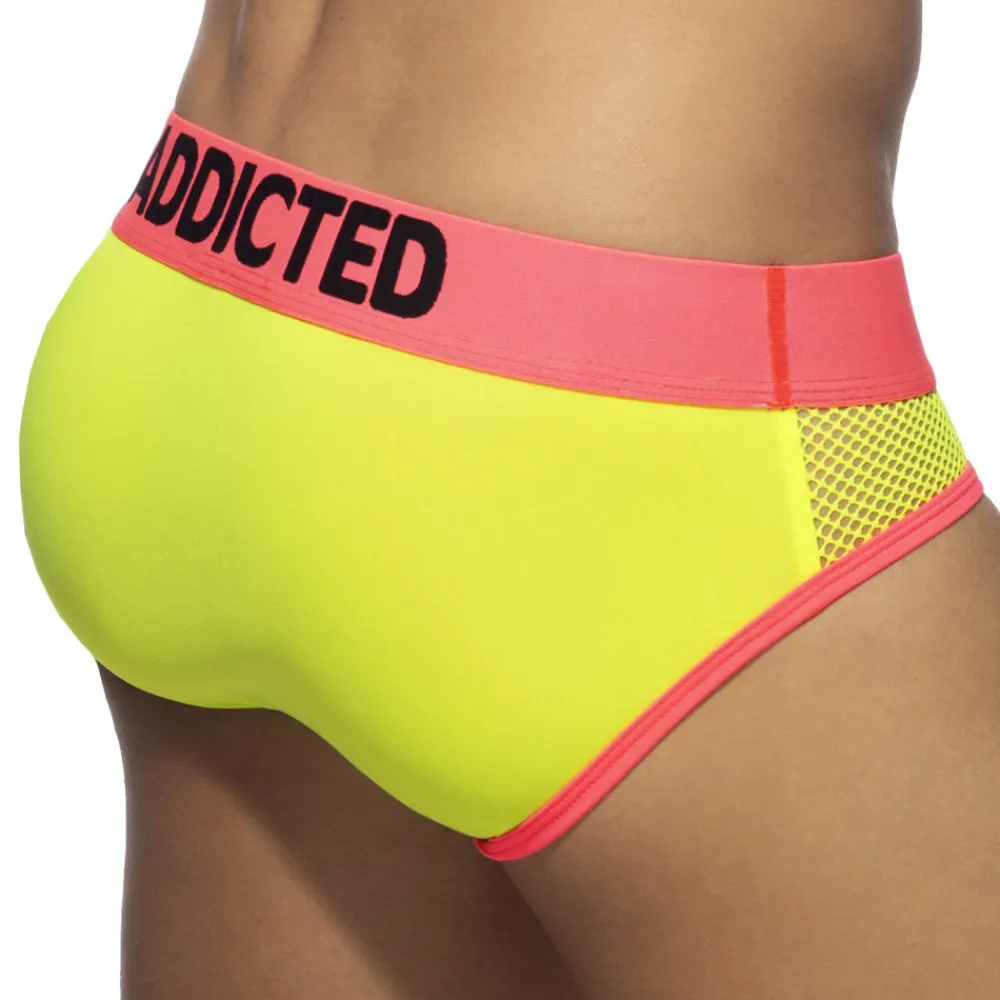 Slip taille basse en microfibre stretch de couleur intense. Panneaux latéraux en mesh ajouré. Poche frontale de grande capacité. Bordures de couleur contrastée. Ceinture élastique signée Addicted.
